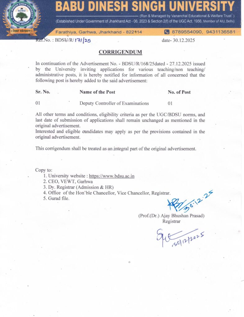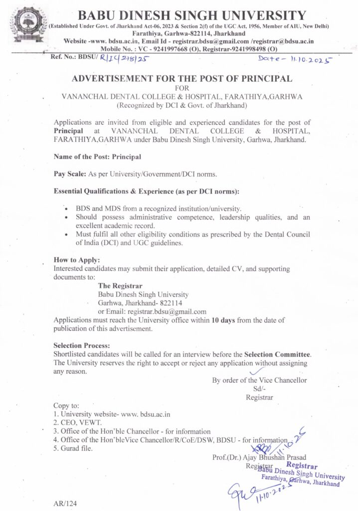 0RECRUITMENT-2025 Eligible and interested candidates are invited to attend the Walk-in Interview(online/offline mode) for the following Teaching Positions in the Babu DineshSingh University, Garhwa, Jharkhand.